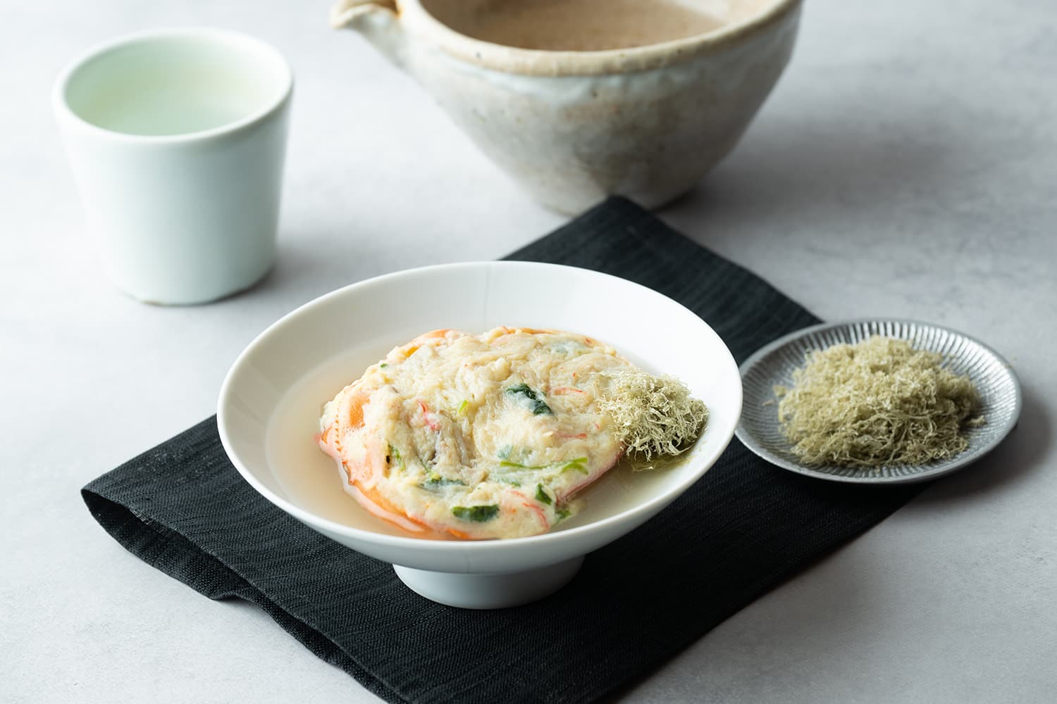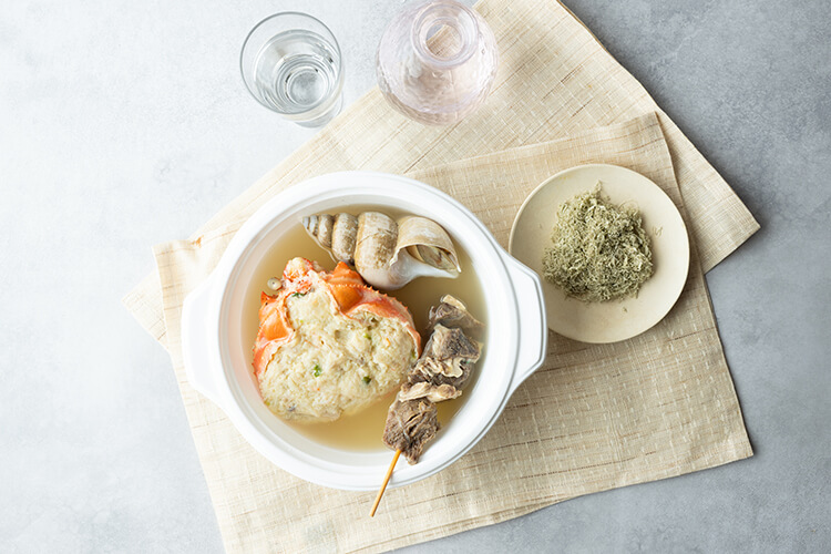 タラのすり身にベニズワイ蟹身やしいたけ、三つ葉などたっぷり具材を蟹甲羅に詰め込み蒸し上げたカニ面はおでんの具としても、蟹面は揚げて香ばしくも召し上がってもいただけます。昆布と塩だけで仕立てた澄んだ黄金だしは好きな具材を足してオリジナルおでんにするもよし余った出汁で雑炊や茶碗蒸し煮ものに使うもよしご家庭でいろいろアレンジして楽しい時間を過ごしていただけたら、嬉しいです。