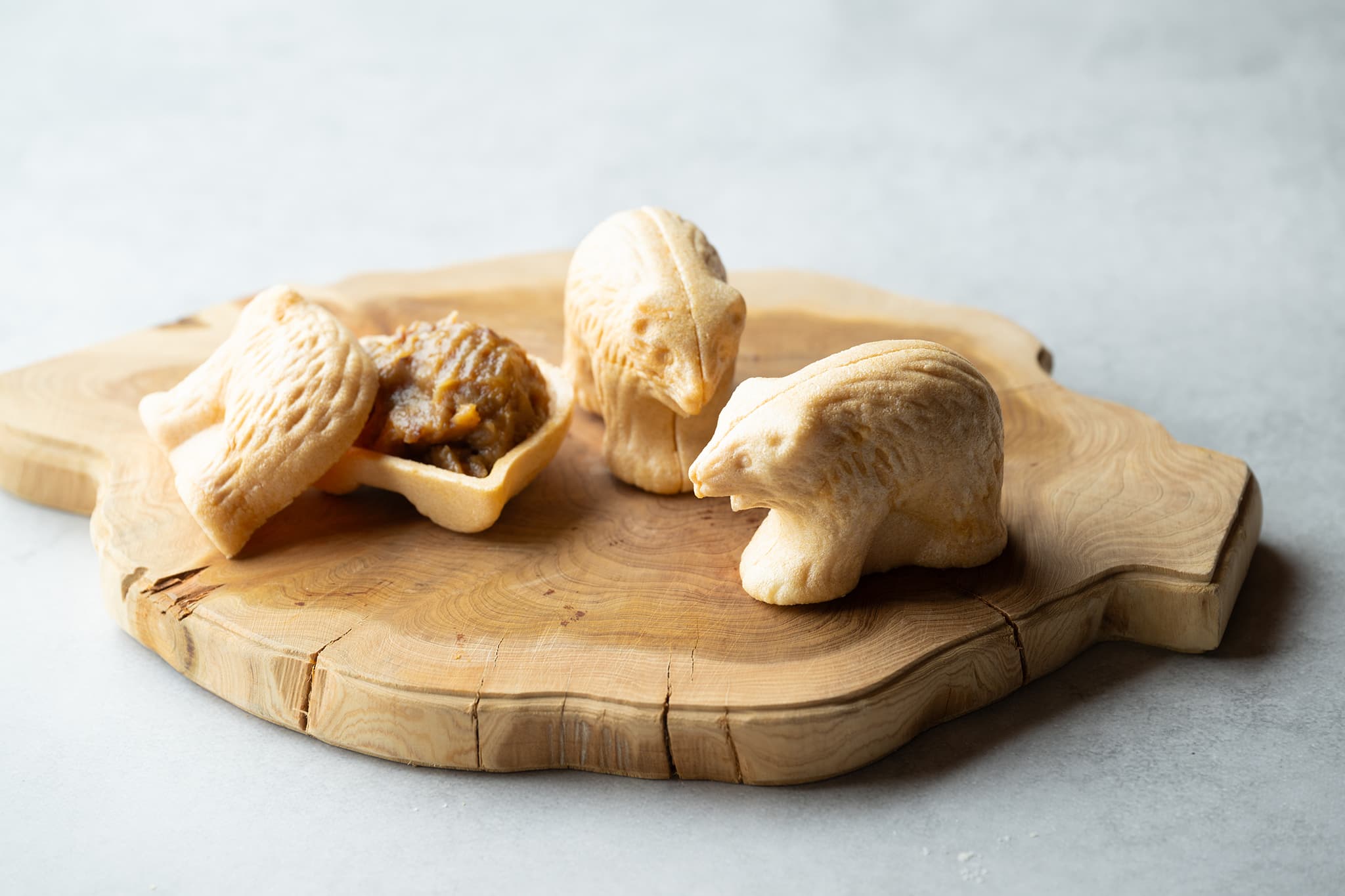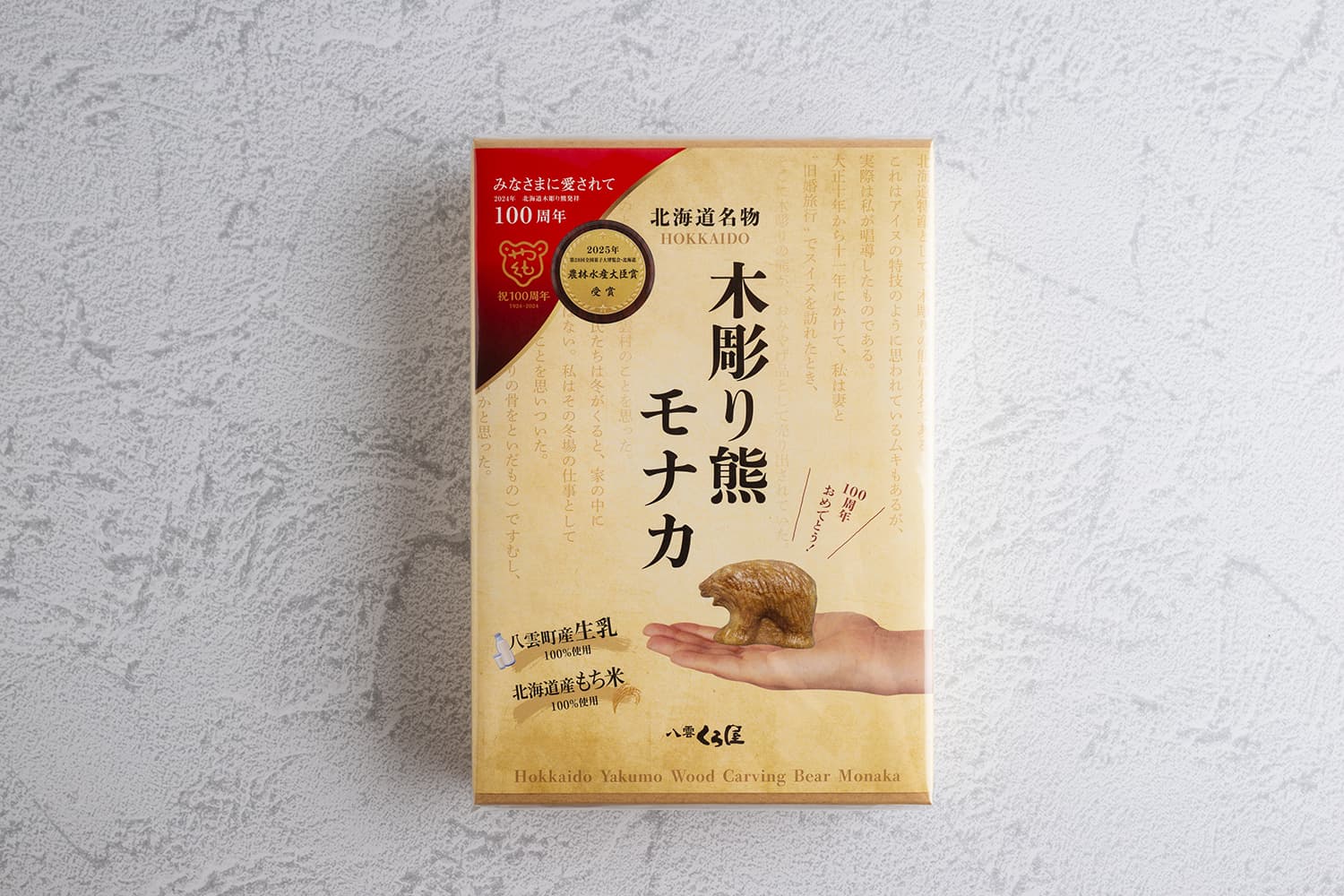 北海道名物 木彫り熊モナカは、砂糖・人工甘味料不使用、グルテンフリーにこだわり、中の餡は、刻みクルミ、地元北海道の八雲町牛乳、国産バター・蜂蜜をじっくり3時間煮詰めた自家製クルミハニーバターキャラメリゼを挟み、一般的な餡子とは別次元の美味しさにしました。皮には北海道産の餅米「風の子餅米」を使用。熟練の職人が一枚ずつ丁寧に焼き上げた逸品です。北海道の恵みを詰め込んだ、心温まる一品をぜひご賞味ください。